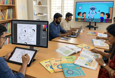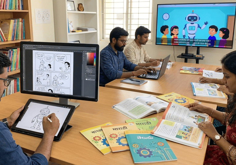 We create our own curriculum, textbooks, comics, and animated learning content in 19 Indian languages to make robotics education engaging, inclusive, and easy to understand